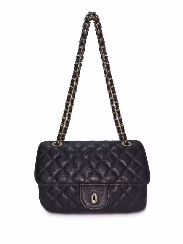 The polished gold-tone chain strap, delicately interwoven for strength and beauty, adds a statement of sophistication. You can wear it in two ways — as a short shoulder bag for formal looks or as a long crossbody for casual elegance. The magnetic flap closure ensures easy access while keeping your essentials safe.